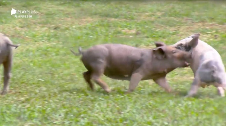 Guilherme Leão limpa chiqueiro, enquanto porquinhos brincam