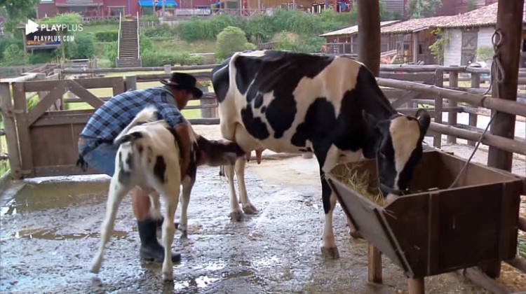 Phavanello tira bezerro da teta da vaca para ordenhar o animal