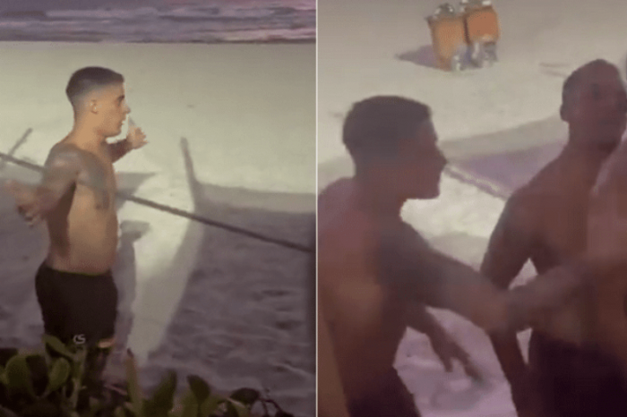 Nas filmagens que circulam na internet, o ex-namorado da mãe de Neymar, Nadine Santos, aparece na praia de braços abertos com semblante de irritação e parte para cima de um homem — que não foi identificado.